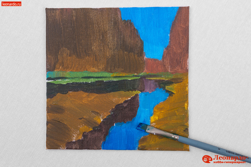 14. Пишем тёмное отражение среднего плана в воде. Используем голубую, тёмно-зелёную краску, умбру. Разделяем тонкой тёмной полосой островок с травой – пусть нижняя часть будет отражением в воде. У горизонта, где наметили просвет, добавим розовый мазок, смешав карминовую краску и белила – это будет отражение дальнего плана в воде.
