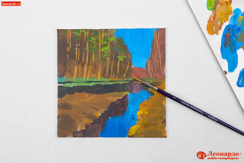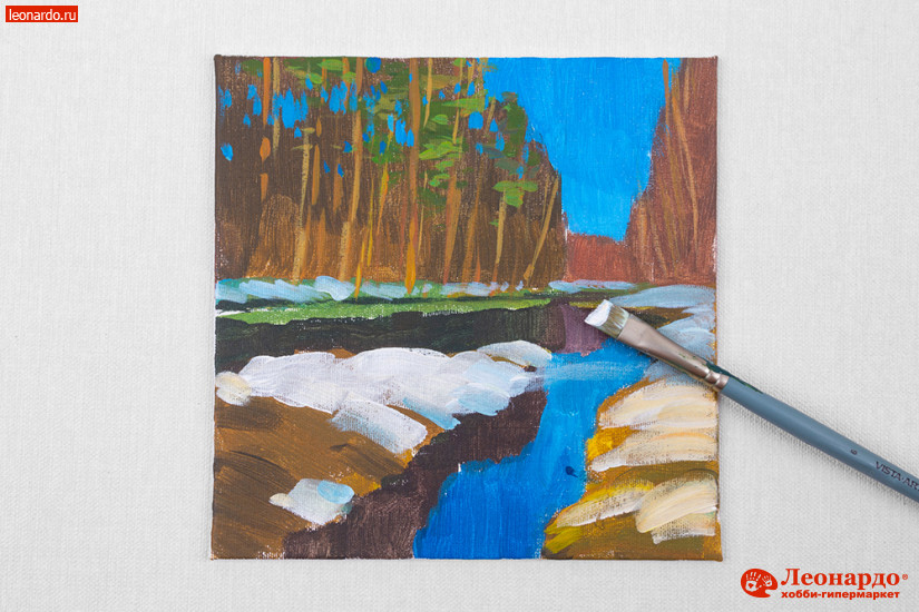 13. Затем с помощью светло-зелёной и жёлтой краски изображаем проступающую травку на дальнем плане. Используя охру и жёлтый, рисуем островки земли и сухой травы. Обратите внимание на направление мазка на этих островках: он наносится под наклоном к ручью. Так мы сможем лучше показать берег.