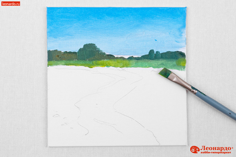 20. Пишем дальний план, используя небесно-голубую, голубую, тёмно-зелёную краску и умбру. Травку на дальнем плане пишем, смешав голубую и светло-зелёную краску.