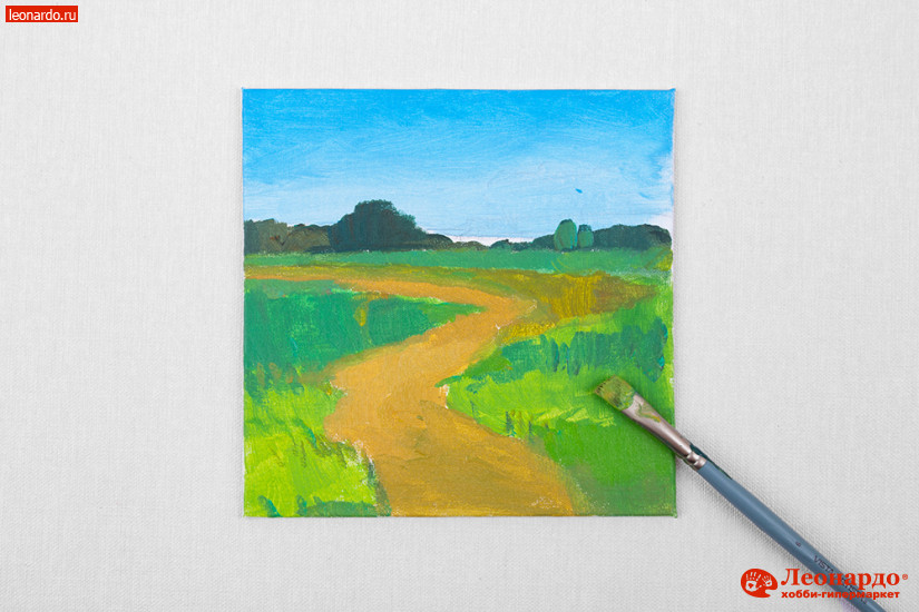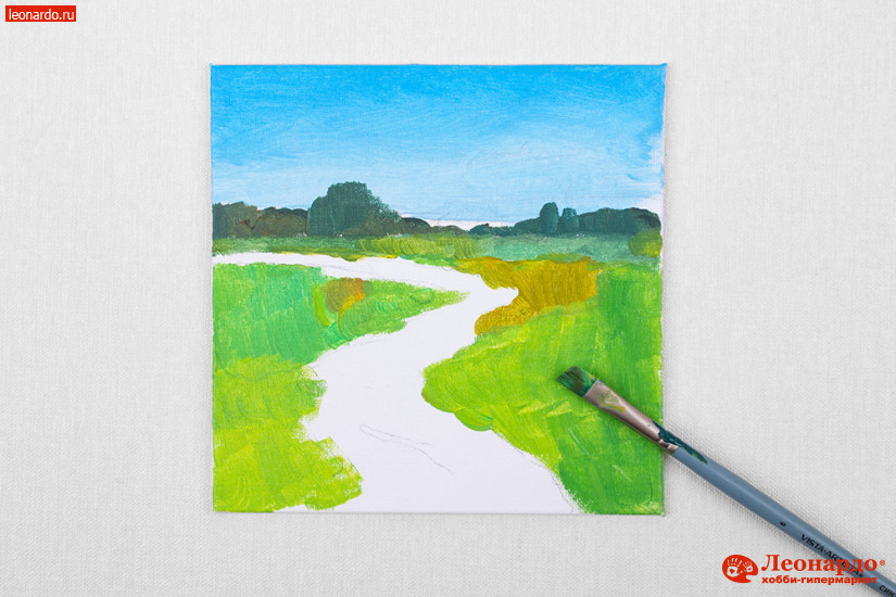 21. Далее, используя в жёлтую, зелёную и синюю краску, пишем траву на среднем и переднем плане. Старайтесь совершать короткие вертикальные мазки. Жёлтого добавьте побольше.