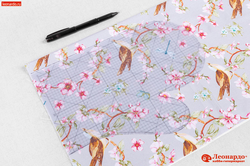 1. Переводим шаблон рукавицы на пластиковый лист и вырезаем по контуру. С помощью ручки для ткани с исчезающими чернилами GAMMA переводим контуры шаблона на сложенную вдвое ткань. Получаем 2 одинаковые детали в зеркальном положении.
