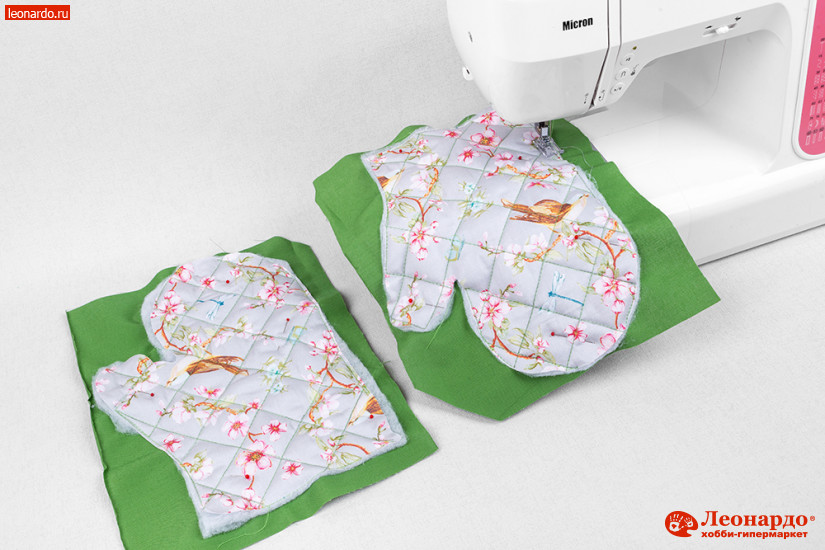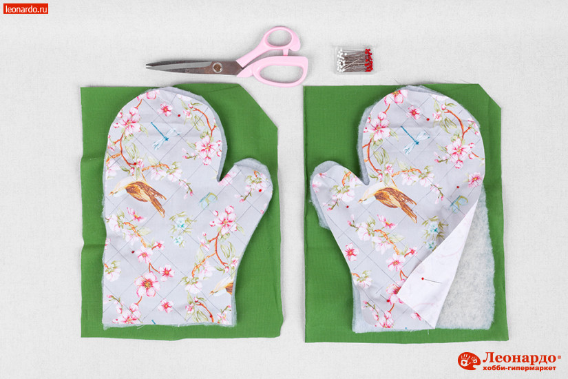 3. Вырезаем рукавицы из ткани по контуру. Дополнительно выкраиваем по размеру рукавицы 2 детали из синтепона. Из зеленой ткани Краски жизни выкраиваем 2 детали прямоугольной формы так, чтобы рукавица полностью помещалась на ней с припуском 2 см по всем сторонам. Скалываем детали в виде сэндвича: ткань подкладки, синтепон, верхняя фоновая ткань.