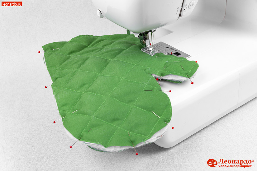 6. Теперь складываем простеганные детали вместе лицом к лицу и скалываем булавками по периметру. Стачиваем детали по краю с припуском 0,5 см. Вход в рукавицу (прямая сторона) не зашивается.