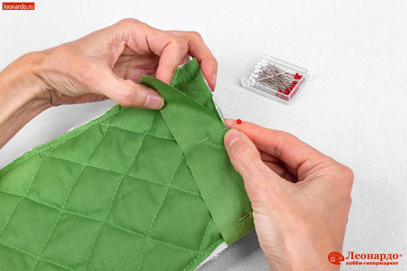13. Бейку отворачиваем на лицевую сторону, огибая край рукавицы. Припуск подгибаем и закалываем булавками.