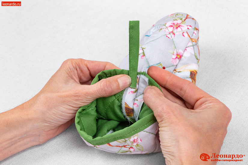14. Петельку складываем пополам и вкладываем её между припусками швов внутри рукавицы. Закалываем.