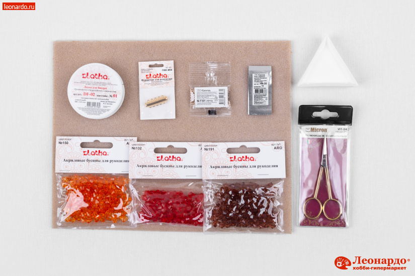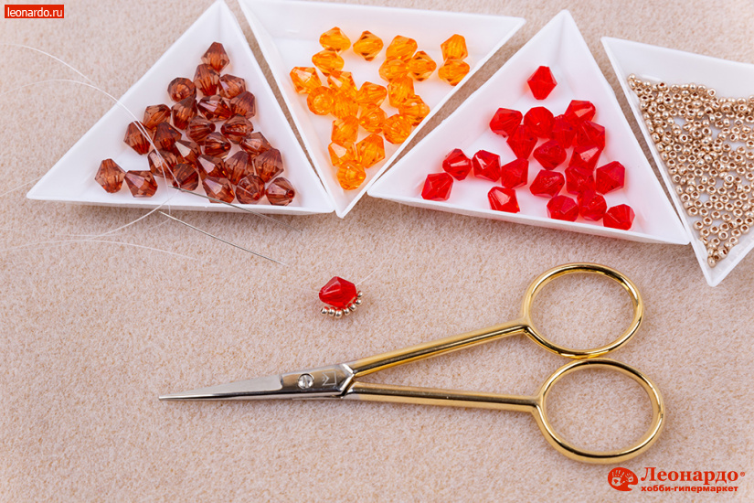 1. Бусины и бисер распределяем по лоткам. Отрезаем леску длиной удобной для работы, примерно 1 м. В плетении участвуют оба конца лески. Плетем по схеме, нанизываем 7 бисеринок и замыкаем красной бусиной в круг (крест) проходя леской через бусину другим концом. Таким образом, оба конца лески перекрещиваются внутри этой бусины. Подтягиваем плетение на середину лески.