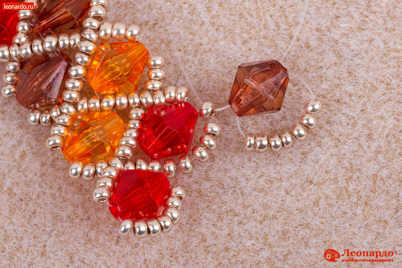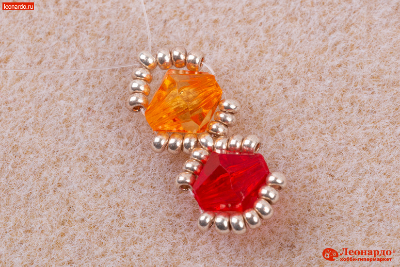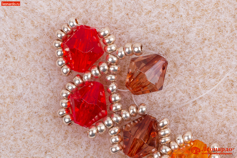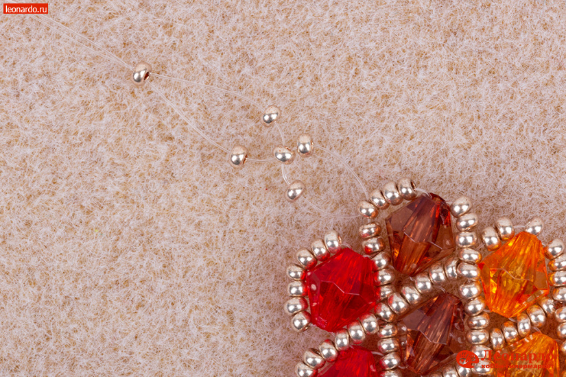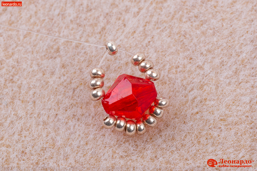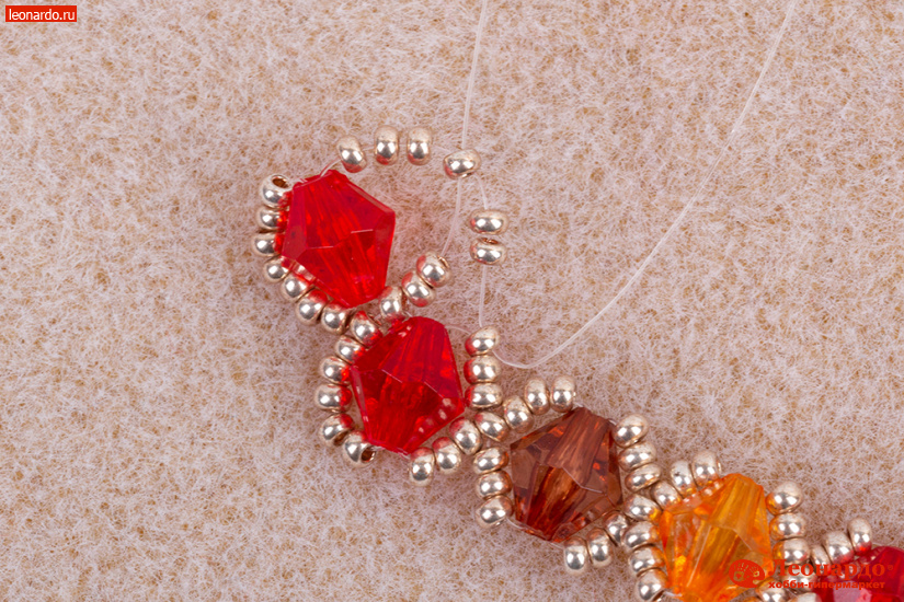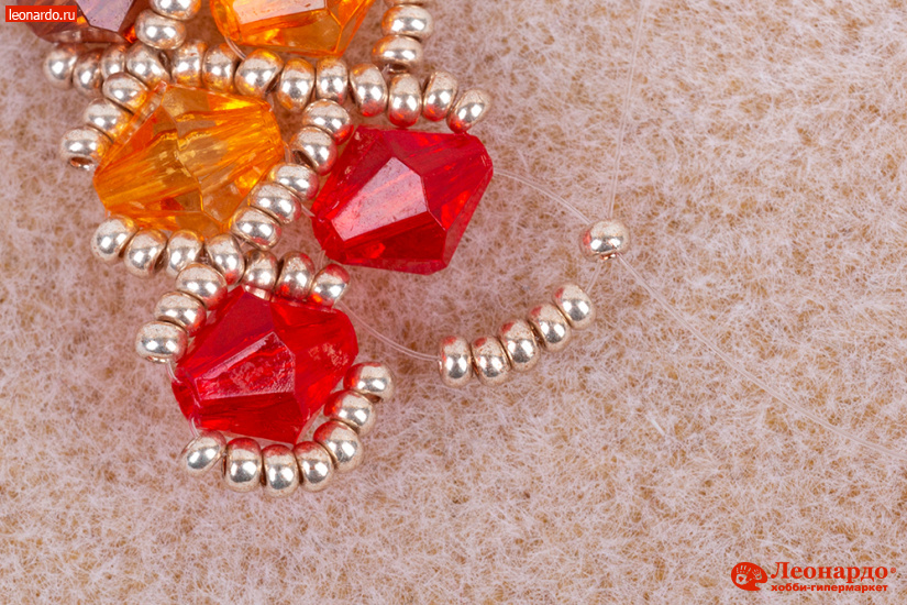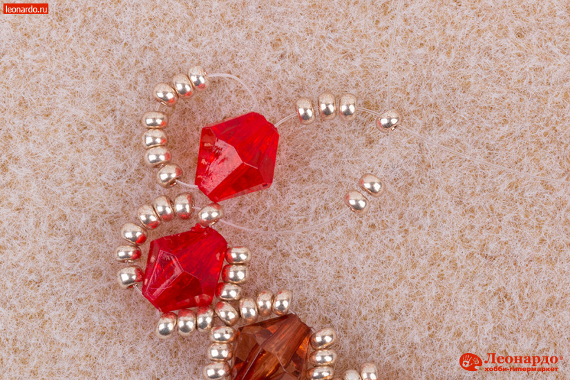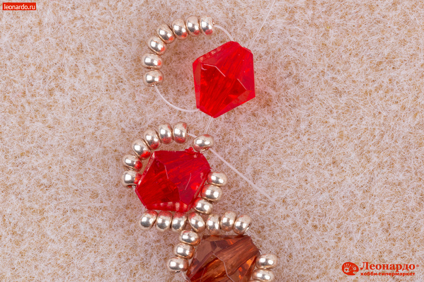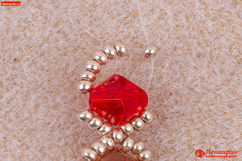 7. На левую леску продеваем бусину красного цвета и семь бисеринок, далее этой же леской проходим через красную бусину, замыкаем.