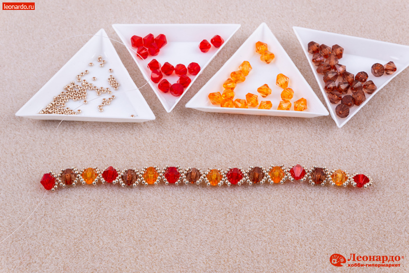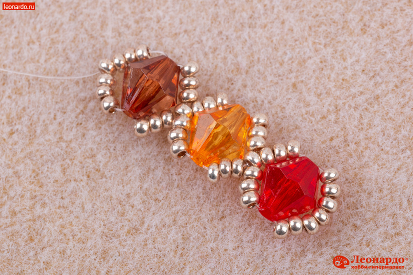 3. На каждую леску нанизываем по три бисеринки и замыкаем оранжевой бусиной. Далее нанизываем по три бисеринки и замыкаем 4-ой бисеринкой. Второй элемент готов.