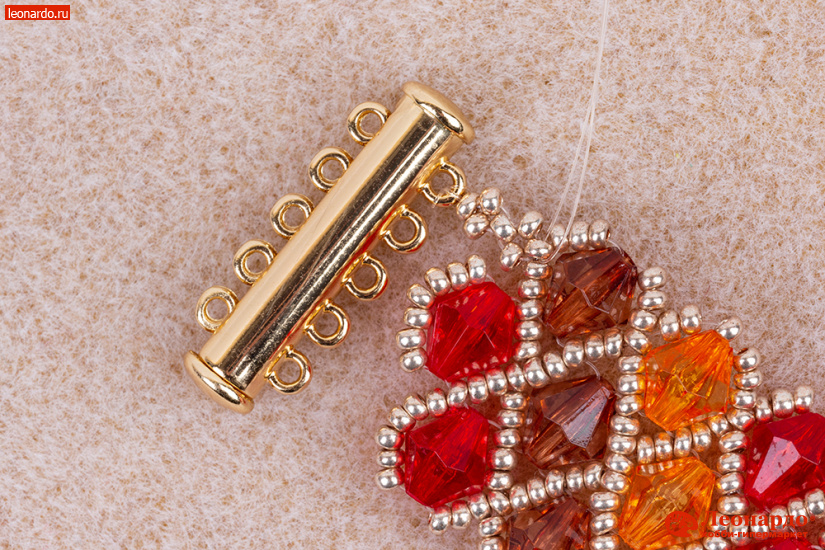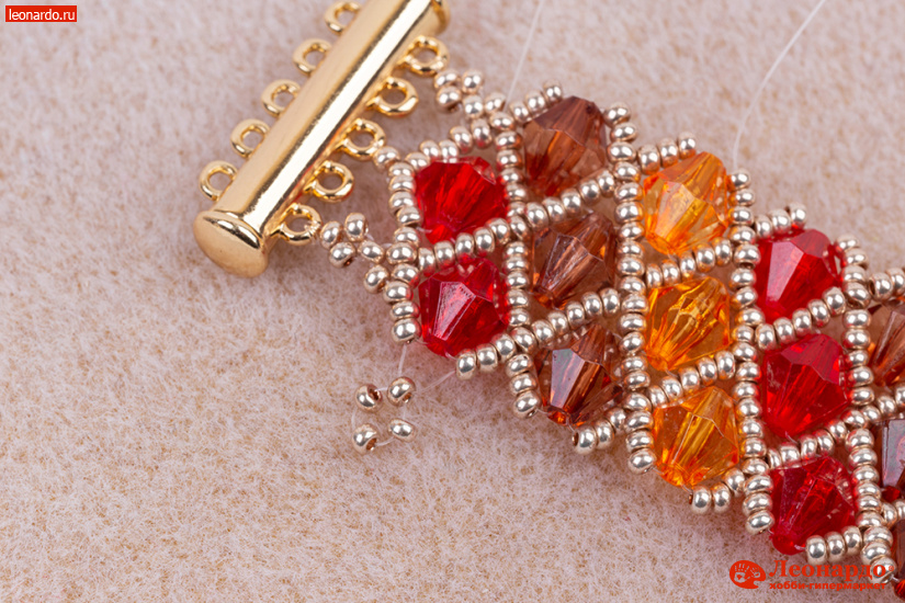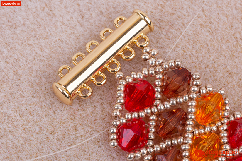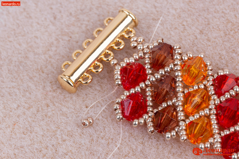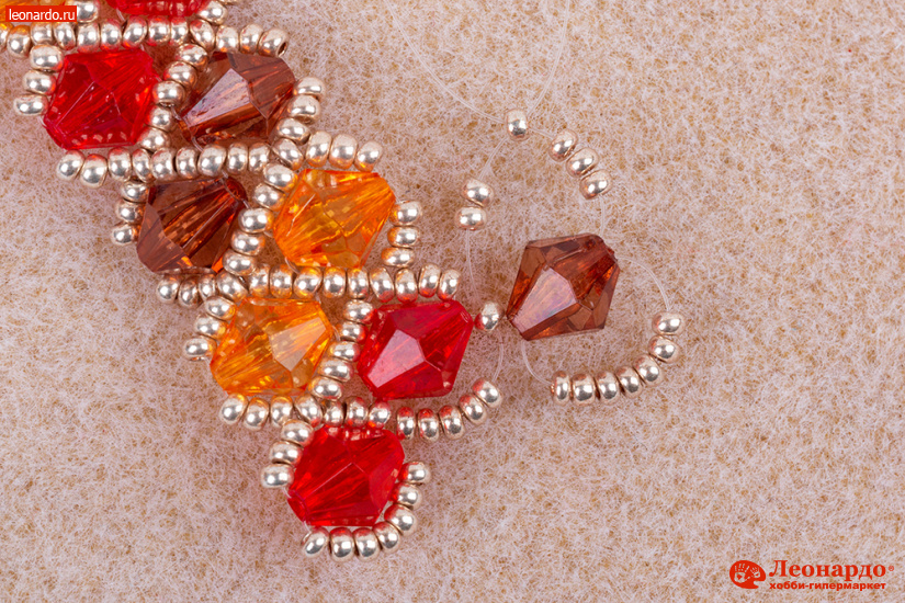 10. На другой конец лески продеваем три бисеринки и замыкаем бусиной коричневого цвета. Далее леску, которая ближе к первому ряду пропускаем через бисеринку первого ряда.