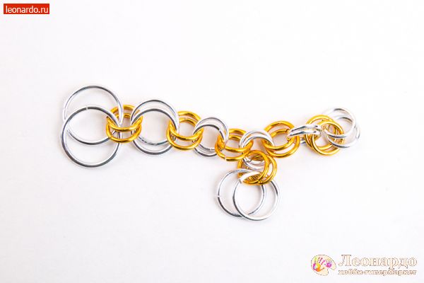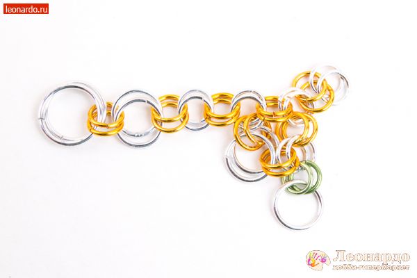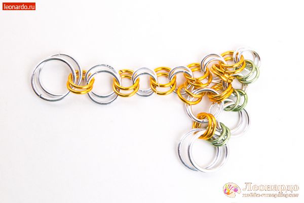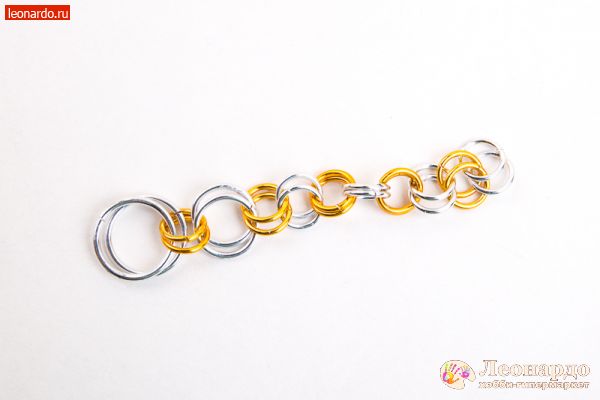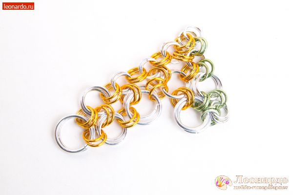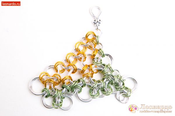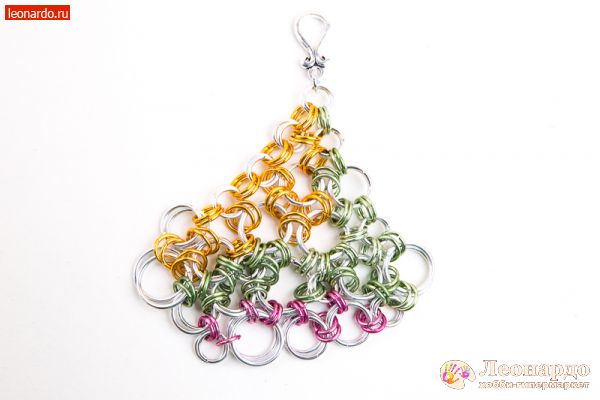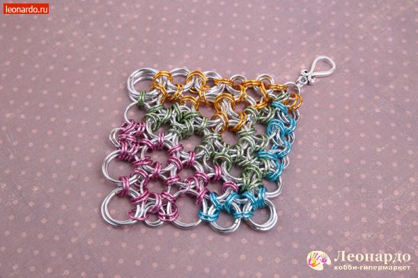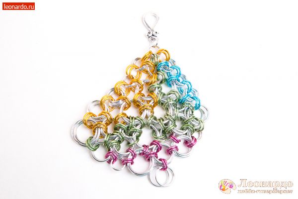 Наш кулон внешне чем-то напоминает полотно кольчуги, только более лёгкий и совсем не воинственный. В этом кроется его шарм: холодный блеск металла сочетается здесь с радужной теплотой цветных колечек и мягкостью их переплетений.