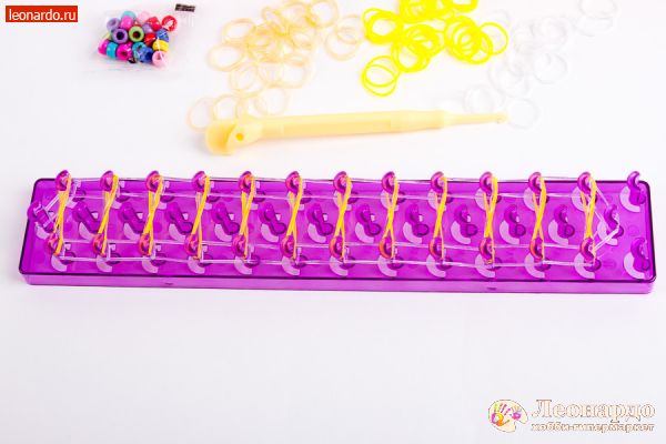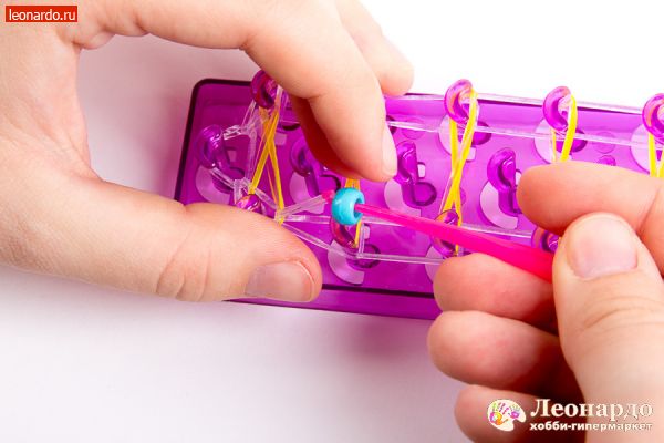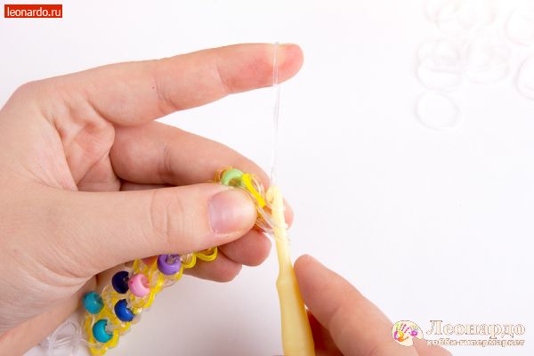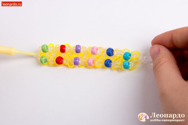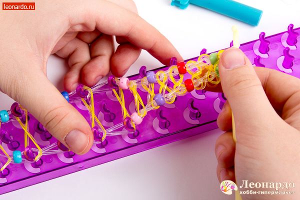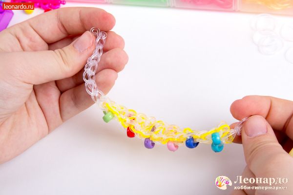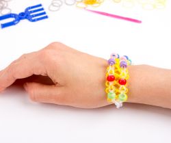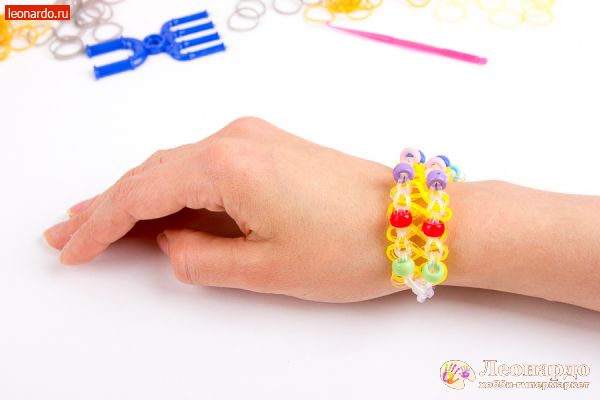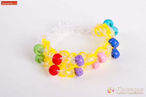 Плетение из резиночек уже прочно вошло в мир рукоделия и заняло в нем едва ли не первые роли – настолько интересным и увлекательным оно оказалось. Сколько веселых и радостных украшений можно сплести, используя эту технику! Каждый новый браслетик – как летний лучик солнышка, теплый и позитивный, не способный оставить равнодушными ни детей, ни взрослых. А если сплести его с использованием цветных бусинок, похожих на капельки звенящей росы на летнем лугу, то получится вот такой замечательный аксессуар, с которым вы останетесь яркой даже в самые пасмурные дни.