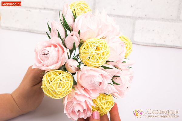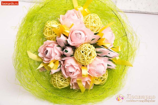 Цветы – это краски жизни, это отзвуки лета и мелодии весны, это нежность и тепло, которые так приятно дарить. Но живые цветы, увы, быстро вянут. Однако есть прекрасный вариант – сделать подарочный букет из гофробумаги, флористических лент и сизаля. Пошаговый фото мастер-класс поможет вам легко разобраться в том, как правильно использовать все эти материалы, а в итоге получится дивная флористическая композиция. Хрупкие тюльпаны и ротанговые шарики – и все это в обрамлении воздушного облака сизали. Настоящая весенняя нежность!