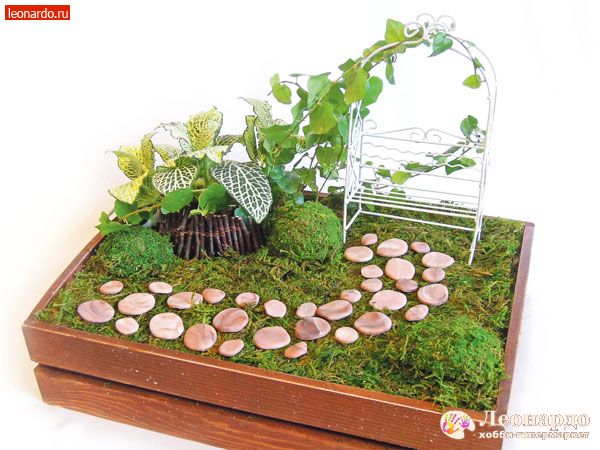 В последнее время стало особенно популярно создание необычных флористических композиций – мини-пейзажей, высаженных в виде небольшого садика. Сюда помещают миниатюрные сорта различных декоративных растений, которые не слишком сильно разрастаются — небольшие папоротники, эписции, изящный аир злаковый. Смотрятся такие флористические композиции лаконично и строго, но в то же время дают простор для фантазии, а также дарят место для медитации. Пошаговый мастер-класс поможет вам не запутаться в процессе работы. Натуральный мох, декоративные шарики, камушки из полимерной глины и, конечно, настоящие растения, которые будут радовать вас и ваших близких. Такое интерьерное украшение никого не оставит равнодушным!