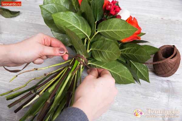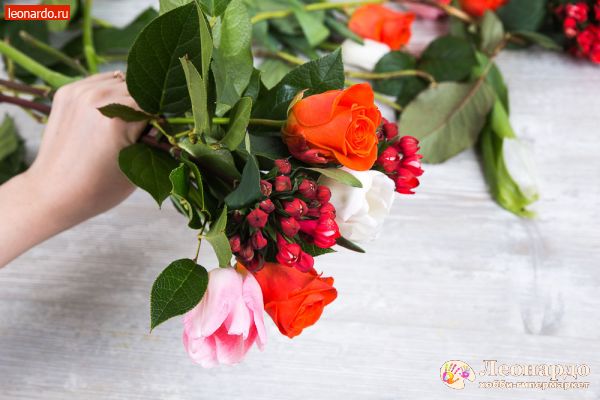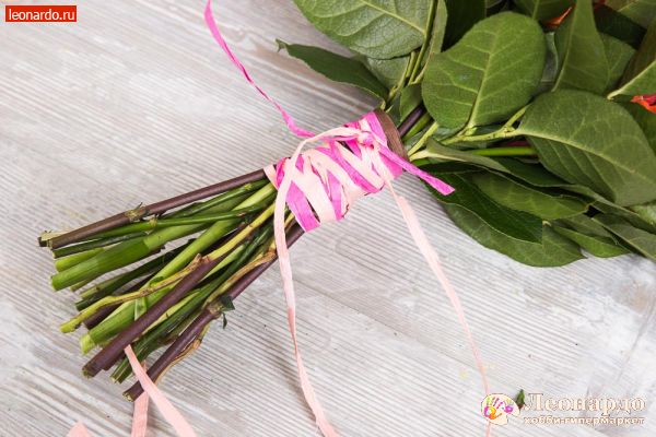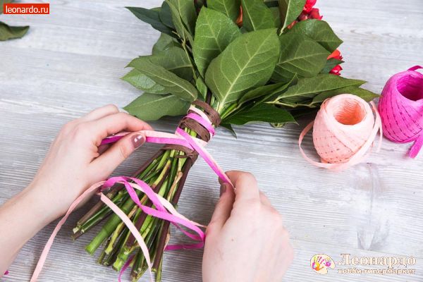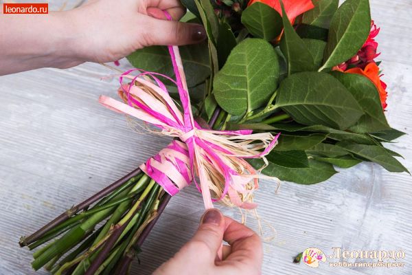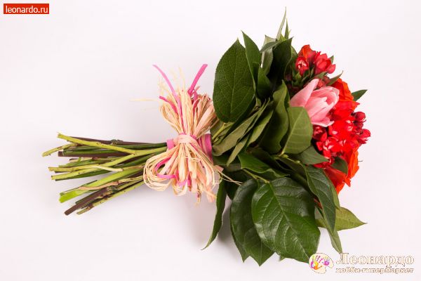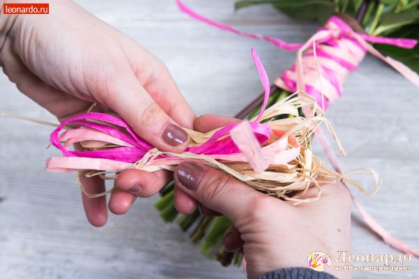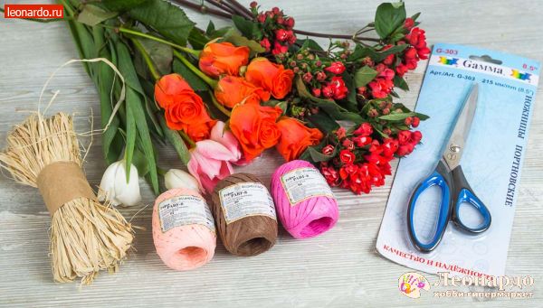 Дарить цветы – это особенное искусство! Ведь оригинально оформленный букет способен подарить вдвое больше эмоций, чем обычный. С подробно разобранным мастер-классом по флористике вам не составит труда превратить простые розы и тюльпаны в яркую композицию. В работе будет использована натуральная цветная рафия – высушенные пальмовые волокна. В сочетании с яркими цветами и сочной листвой она будет смотреться особенно выгодно. Готовый букет можно подарить подруге, маме или бабушке, или же просто украсить столь чудесной композицией свой дом.