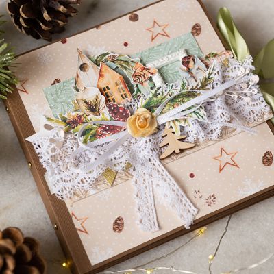 Одно из направлений техники скрапбукинга – создание альбомов. Такие альбомы всегда украшены милыми деталями – бантами, пуговицами, кружевами, деревянным декором и т.д. Ведь дословно название техники переводится как «книга из вырезок». И сегодня мы создадим альбом, наполненный теплом зимних семейных вечеров.