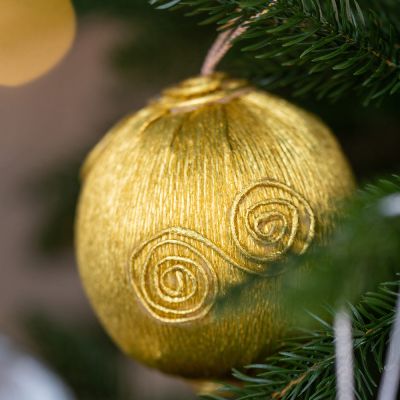 Декорируем новогодние шары из пенополистирола блестящей гофрированной бумагой и ажурными элементами.