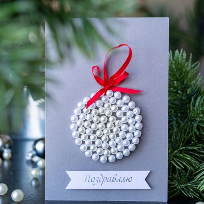 Делаем простую открытку с новогодним шаром из блестящих бусин и алой ленты.