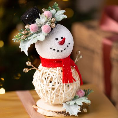 Оригинальный декор из пенопласта и ротанга – снеговик в модной шляпе.