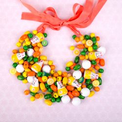 Воздушное колье выполнено из бусин необычной формы в виде фруктов и фигурок животных.
