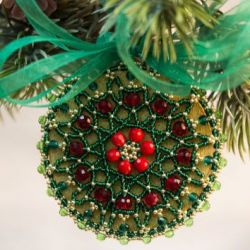 Необычное елочное украшение из бисера в традиционных новогодних тонах.