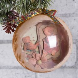 Оригинальный новогодний шарик, выполненный с использованием техники скрапбукинга и нанесением разноцветного песка.
