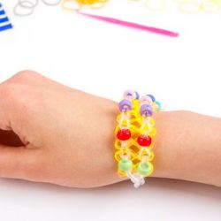 Яркий, радующий взгляды браслетик, сплетенный из резиночек с добавлением бусинок – словно капельки лета у вас на запястье.