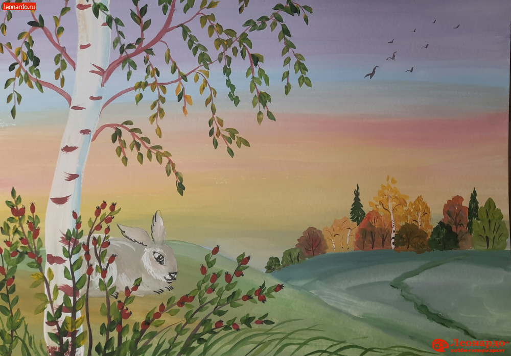Картина художественной гуашью «Зайчик в осеннем лесу»