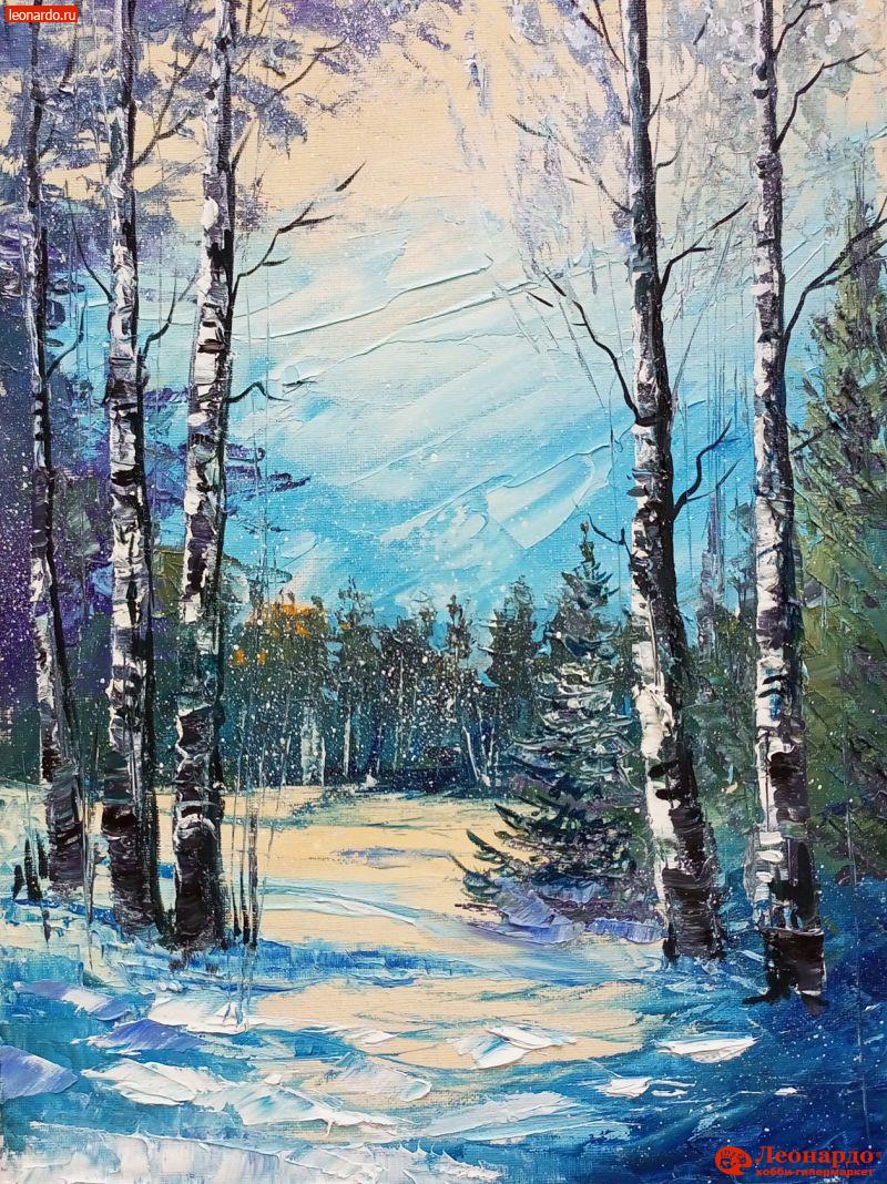 На мастер-классе вы освоите базовые навыки работы с масляными красками и напишете мастихином солнечный зимний день в лесу.