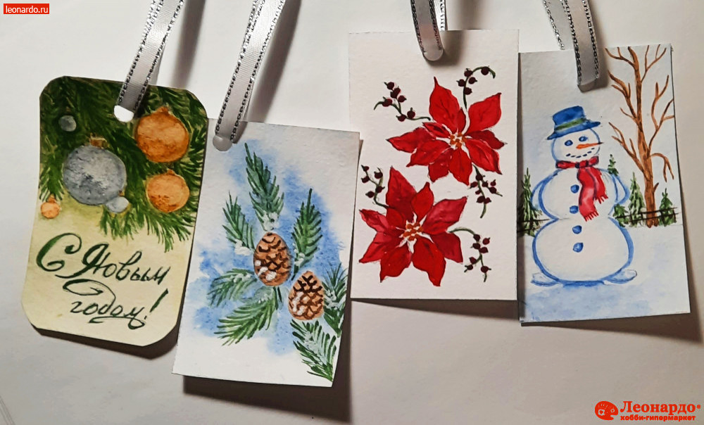 На мастер-классе вы подготовите небольшие заготовки под бирочки, в акварельной технике напишете 4 новогодних сюжета и оформите бирочки на ленточки для крепления к подаркам.