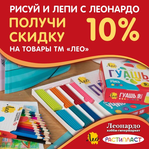 А главное – за готовую работу вы получите скидку 10% на товары ТМ «Лео» в сети хобби-гипермаркетов «Леонардо»! Это предоставит возможность уже сейчас выгодно подготовиться к учебному году. Воспользоваться скидкой можно только в день посещения мероприятия.