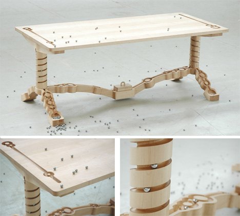 Это не пойми что - то ли головоломка, то ли стол. В Японии сейчас популярны головоломки с металлическими шариками, катящимися по вертикальному лабиринту, тут и дизайнер со столиком подоспел. Главное при пользовании таким столом - смотреть под ноги, потому что часть шариков неизбежно упадет под стол и будет создавать кучу неудобств.