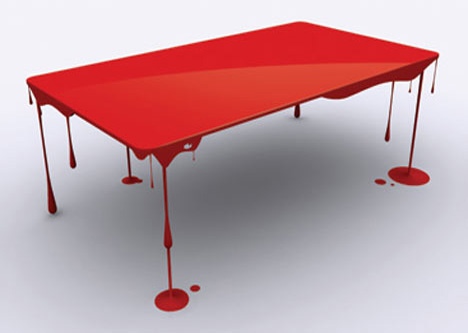 Старый стол всегда можно немного оживить с помощью хорошей краски и кисти. Этот стол доводит процесс "оживления" до максимума, в полной мере создавая иллюзию плоскости, залитой алой краской и парящей в воздухе. Такая идея пришла в голову дизайнеру Джону Нуанесингу (John Nouanesing), спрятавшему ножки стола в воображаемых потеках краски.