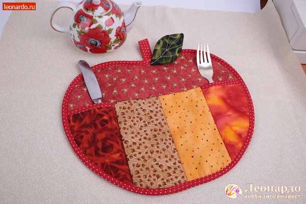 - Подставка под столовые приборы «Яблоко» в технике лоскутное шитьё на швейных машинах – отличное украшение кухонного интерьера.