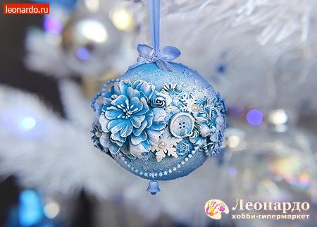 Шар «Морозное утро». Декор в технике альтер-скрап. Это уникальная техника и популярное направление в искусстве. Здесь смешиваются современные декоративные материалы и техники с какими-то старыми или заурядными вещами. Скрапбукинг, декупаж, штампинг, старые и новые пуговицы, металлическая фурнитура, структурные пасты, полимерная глина и т.д. Эффект потрясающий!