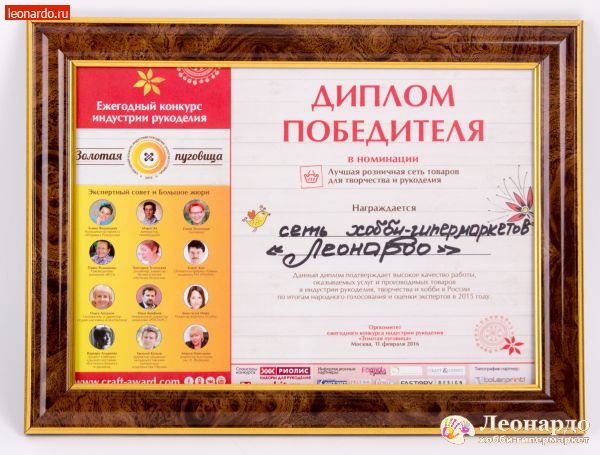 11 февраля 2016 года состоялось главное событие в индустрии рукоделия, творчества и хобби в России – вручение премий ежегодного Конкурса индустрии рукоделия «Золотая пуговица». И по итогам 2015 года сеть хобби-гипермаркетов Леонардо стала победителем в номинации «Лучшая розничная сеть товаров для творчества и рукоделия».