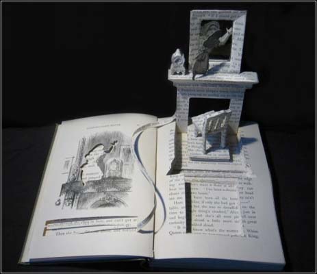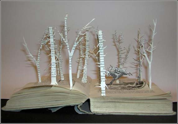 Сью Блэквелл (Su Blackwell) окончила Королевский колледж искусств в 2003 году. Она создает замысловатые произведения искусства из книг, превращая их в фантастические трехмерные миры. С помощью хирургического инструмента, скальпеля, талантливая англичанка вырезает и клеит страницы для создания миниатюрных диаграмм, освещенных светом, которые помещены в деревянные коробки или стеклянные витрины, напоминая викторианские реликвии, выставленные в музее.