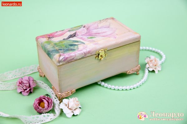 В ассортименте хобби-гипермаркетов Леонардо широко представлены как готовые наборы для декупажа, так и разнообразные коллекции салфеток и рисовой бумаги, фирменные лаки высокого качества и множество вспомогательных инструментов и основ для декора.