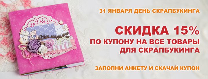 В честь этого радостного события сеть хобби-гипермаркетов «Леонардо» объявляет праздничную акцию. В любом магазине «Леонардо» на всей территории России 31 января можно купить по купону* со скидкой 15%** все товары для скрапбукинга. Поэтому, если этот вид рукоделия вам еще не знаком, самое время его освоить. Приходите и выбирайте материалы и инструменты: