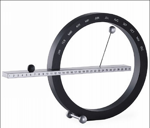 Очень необычный экземпляр "вечного календаря". Два шарика-магнита означают месяц и дату, а чтобы девайс на самом деле показывал "который сейчас день", это шарики каждый день нужно передвигать на следующее деление. Слишком много возни, скажете? А чему тут удивляться, вель девайс изначально был изготовлен для Музея изделий из магнитов и прессованного пластика, а вовсе не для частого использования...