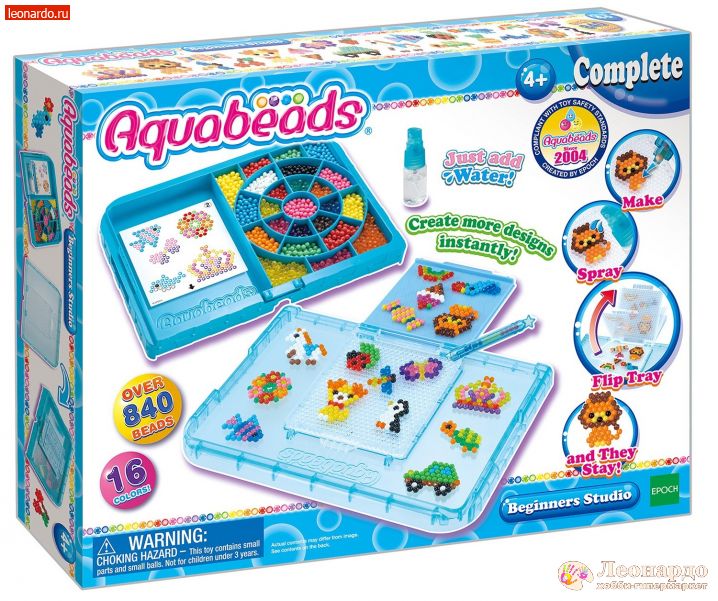 Ещё одна интересная новинка из Японии – аква-мозаика от ТМ Aquabeads*, основанная на простой, быстрой и эффективной технологии скрепления бусин при помощи воды. Детям обязательно понравится необычный процесс: бусины выкладываются на форму из прозрачного пластика, под которой устанавливается лист-шаблон, и соединяются при помощи воды. Игрушка готова, когда вода впиталась, а все элементы скрепились между собой!