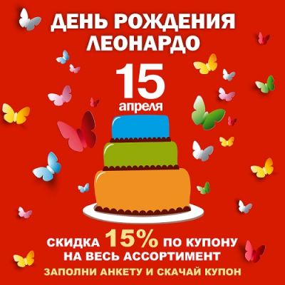 Только один день, 15 апреля, в честь своего дня рождения торговая сеть «Леонардо» дарит покупателям скидку 15% на весь ассортимент. Скачивайте купон и приходите за праздничными покупками!