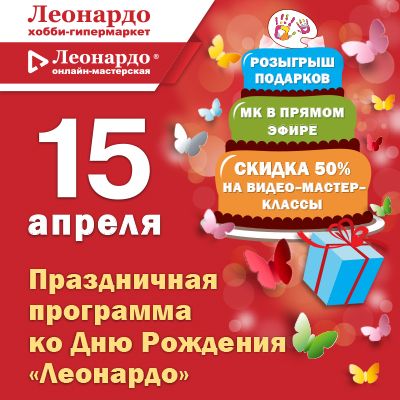 В честь дня рождения сети хобби-гипермаркетов «Леонардо» гостей в прямом эфире в инстаграм- аккаунте Онлайн-мастерской «Леонардо» @leonardo.masterclass ждут викторина с призами, мастер-класс в прямом эфире и возможность пообщаться с опытным мастером по флористике.