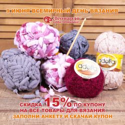 В честь Всемирного дня вязания на публике «Леонардо» дарит рукодельницам на 9 июня скидку 15% на все товары для вязания. Для покупок в хобби-гипермаркете нужно заранее оформить купон, а в интернет-магазине нужно просто оформить заказ 9 июня.