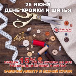 В День кройки и шитья в хобби-гипермаркетах и интернет-магазине «Леонардо» действует 15% скидка на все товары для шитья, включая швейные машины! Скидочный купон оформляется заранее и действует только 25 июня.