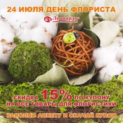 В магазинах «Леонардо» 24 июля, в День флориста, ждут всех, кто интересуется цветочным делом и декорированием. Заранее заполните анкету, получите купон и выбирайте со скидкой 15% любые товары Blumentag и Fiorico.